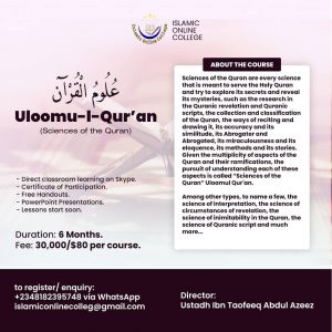 Islamic Online College (IOC) introduces: Uloomu-l-Qura’an (Sciences of the Qur’an), and Fiqh Mu’aamalaat al-Maaliyyah (Islamic Finance) courses…. Contact +2348182395748 to get registered. Lessons start soon..